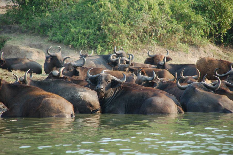 Tegen het eind van de middag reden we naar het Kazinga Kanaal waar we op een rondvaartboot stapten. Ook hier kregen we de tip aan de linkerkant van de boot te gaan zitten, omdat er weer voornamelijk langs de linkeroever zou worden gevaren. Het Kazinga Kanaal verbindt Lake George met het lager gelegen Lake Edward. De lodge ligt op een schiereiland in Lake George. Het was een mooie boottocht, waarbij we vanaf het water heel veel verschillende diersoorten zagen. Vaak gewoon naast of door elkaar. Op de eerste paar honderd meter zagen we al olifanten, buffels, nijlpaarden, krokodillen, nijlganzen, ibissen, een yellow billed stork en nog meer vogels. Dit bleef eigenlijk de hele tijd zo doorgaan. Zo aan het eind van de dag kwamen veel dieren drinken of badderen aan de rivier. We zagen nog veel buffels, olifanten, nijlpaarden en vogels. Ook zagen we waterbokken en heel in de verte een hyena (alleen goed te zien met een verrekijker). Toen we Lake George bereikten keerden we weer om en voeren we dezelfde route, maar nu wat sneller weer terug. In het hostel bij het ongezellige restaurant/bar gegeten. Je moet op zulke plaatsen je eten 's middags al bestellen, zodat je er zeker van bent dat je ook kunt eten waar je zin in hebt en dat het voorradig is. Het menu wisselt hier per dag, al naar wat er voor handen is.