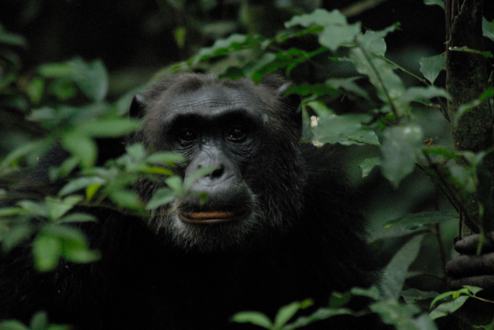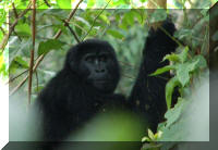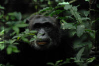 | Toen we bij die groep aankwamen waren er net een paar chimpansees op de grond, waaronder een groot mannetje, dat ons op een paar meter afstand zat te bestuderen. Toen schrok hij ergens van en vertrok. De rest van de chimpansees van die groep zat ook weer in de boomtoppen. Omdat het bos dichtbegroeid en vrij donker is, was het best moeilijk om de apen goed te zien. Nadat de gids had aangegeven dat onze tijd bijna om was en we over tien minuten zouden vertrekken werd er door de andere groep chimpansees hard geroepen, de groep waar wij eerder bij hadden gestaan. De groep waar we nu bij stonden reageerde daar al roepend op en de apen kwamen stuk voor stuk uit hun boomtop naar beneden om ergens anders heen te gaan, waarschijnlijk naar de andere groep. Dit was een spectaculair gezicht, al die apen die uit de bomen naar beneden klommen met hun sterke armen en poten. |