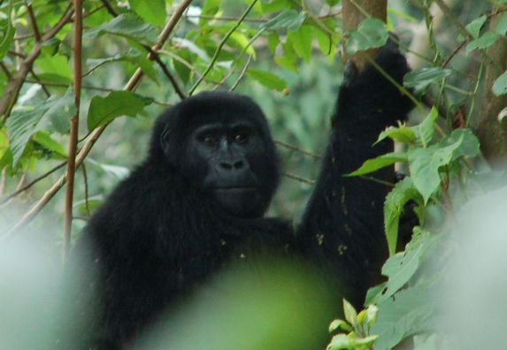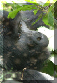 | We liepen iets verder en zagen daar een andere gorilla onder een boom zitten en een jonge gorilla in de boom. Verderop waren ook nog een paar kleine gorilla's in een boom. Onder een hele berg takken zat nog een vrouwtje en even later zagen we ook een heel klein gorillaatje. Ik heb het maar even heel kort gezien, want daarna kwam de grote silverback van de groep eraan en die onttrok de kleine aan ons gezicht. |