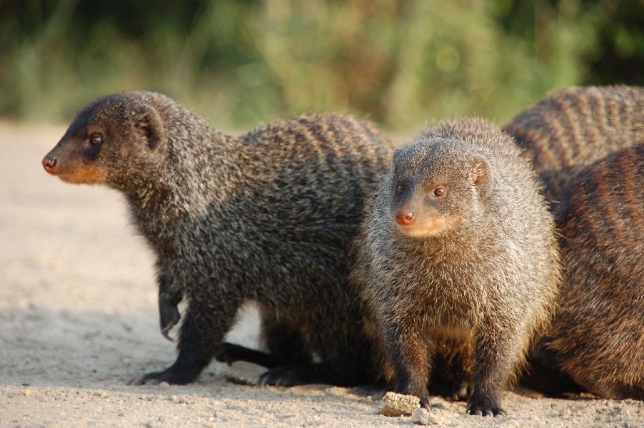 De volgende dag was een reisdag. Na het ontbijt in het hostel kwam er nog een stel zebramangoesten over het terrein lopen. Deze kleine beestjes gingen voor de bar in de zon zitten, zodat ik er hele mooie foto's van kon nemen. Wat heel uniek was, was dat ze ook op een wrattenzwijn klommen, dat daar in het zonnetje lag te dutten. Ze bevrijdden hem van teken en andere insecten. Wat een leuke beestjes om naar te kijken.