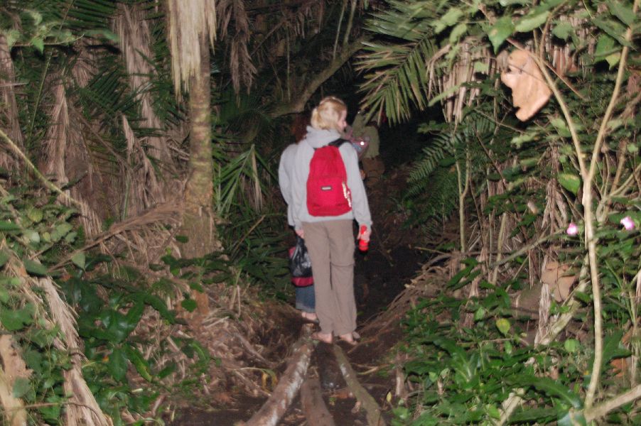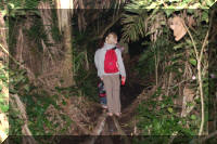 | Het begon met een hele steile afdaling naar beneden, de kloof in. In de kloof was het erg nat en soms glibberig en moesten we regelmatig over stroompjes water stappen, over smalle boomstammen balanceren, of over keien die in het water lagen naar droge stukken stappen. Toen ik van een reisgenoot een stok had gekregen om mee te lopen ging het makkelijker, maar toen hadden we het zwaarste stuk al gehad. Het laatste stuk ging weer omhoog. |