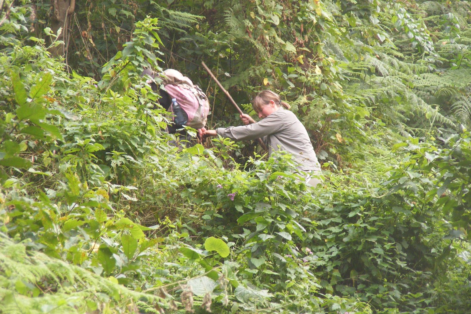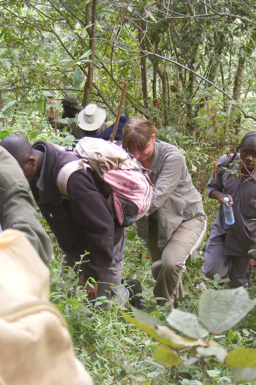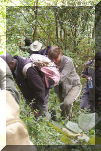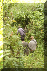 | Toen het uur voorbij was liepen we weer terug naar de rivier. Dit was nog best een moeilijk steil stukje. Hier was geen pad en ik miste hier een helpende hand van Medit of Fred en ook mijn wandelstok. Naar de gorilla's toe is geen pad, omdat zij elke dag weer op een andere plek zitten. Toen we het riviertje weer waren overgestoken stonden op het open veld alle dragers met onze bagage op ons te wachten. Hier konden we onze packed-lunch die we die ochtend vanuit het hotel hadden meegekregen. Hierna moesten we de klim terug naar het UWA kantoor maken. De ongeveer 700 meter hoge helling op. Ik had verwacht dat we over hetzelfde moeilijke pad weer terug moesten en was me daar al mentaal op aan het voorbereiden, toen bleek dat we bij een heel mooi vlak pad aankwamen. Dit pad leidde naar het overnachtingskamp van de trackers. |
