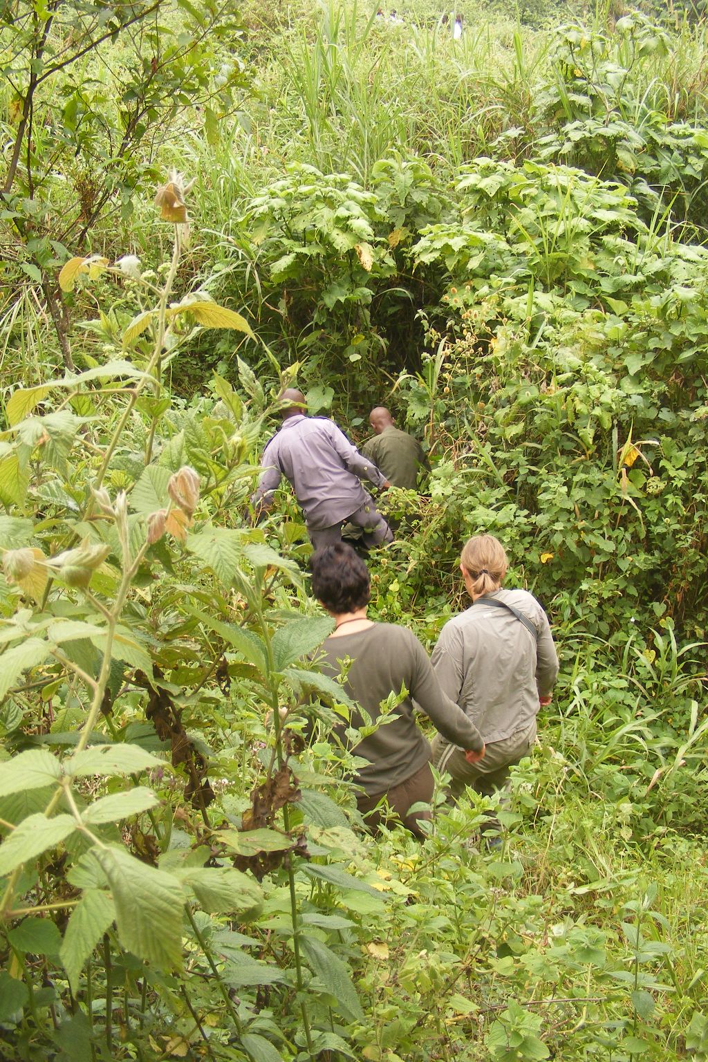 De trackers houden elke avond in de gaten waar de gorilla's hun nesten van die nacht bouwen. De volgende ochtend gaan ze vroeg op pad en volgen vanaf de slaapplek de sporen van de gorilla's. Als ze de gorilla's gevonden hebben weet de gids waar hij de toeristen die dag naar toe moet brengen. Na nog ongeveer een half uur gelopen te hebben moesten we onderaan de helling een riviertje oversteken. Aan de overkant van de rivier op een andere helling stonden de trackers op ons te wachten en moesten we onze camera's uit onze tassen halen (en de extra batterijen niet vergeten) en de tassen achterlaten bij de dragers. De gids en de trackers namen ons nog een stukje verder mee het bos in, de helling op. Na nog ongeveer 10 minuten lopen (en 1½ uur in totaal) zagen we op een helling in de verte onze eerste gorilla. Daarna liepen we richting de gorilla's die lekker zaten te eten. Ze zaten allemaal een beetje uit elkaar op een eigen plekje.